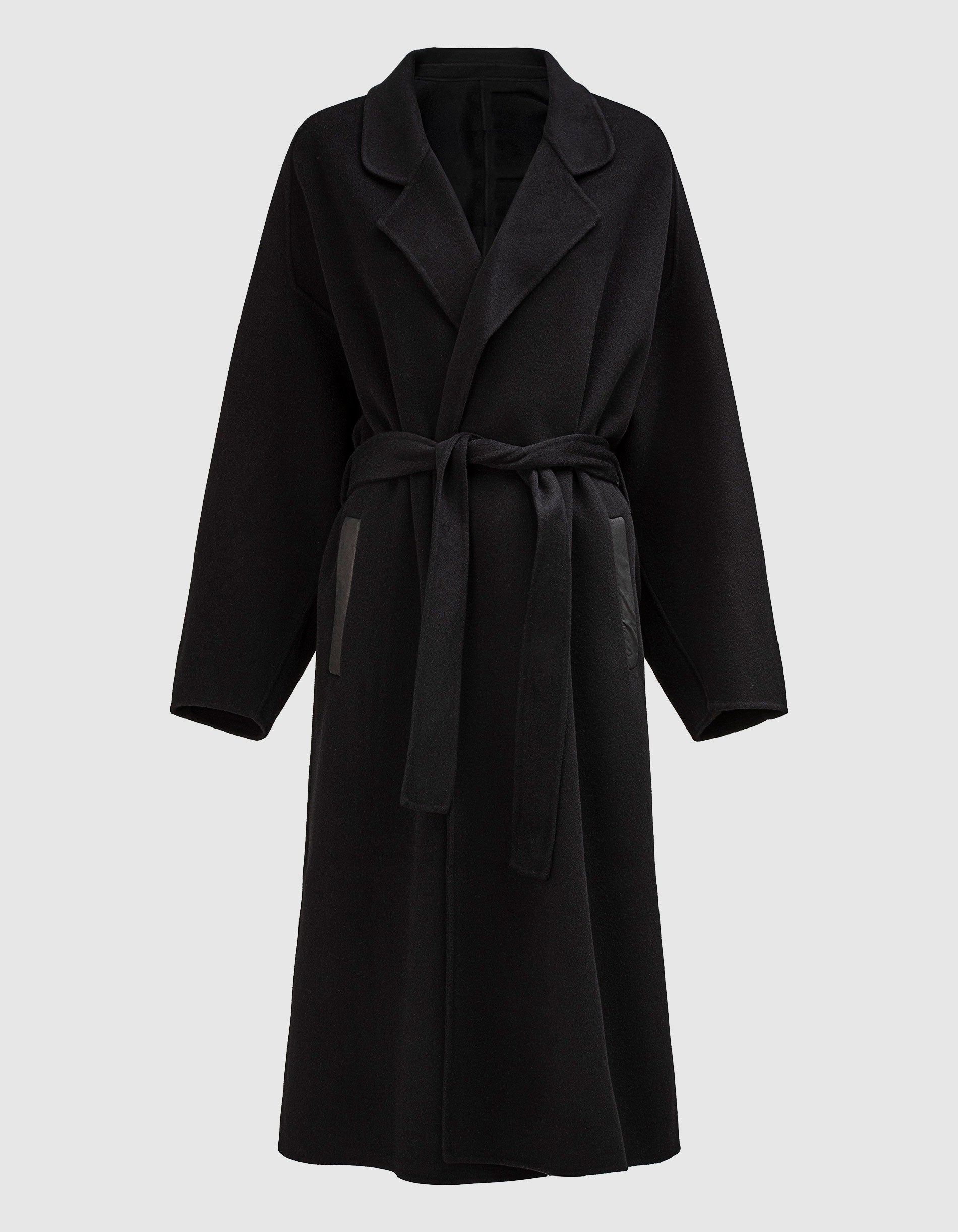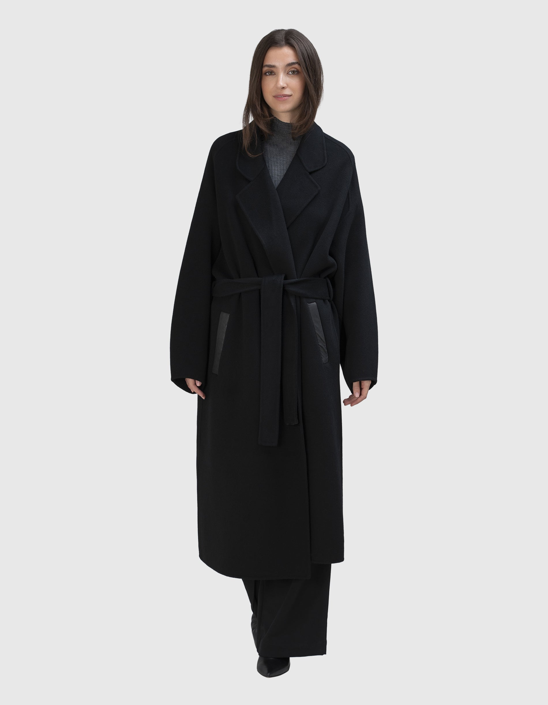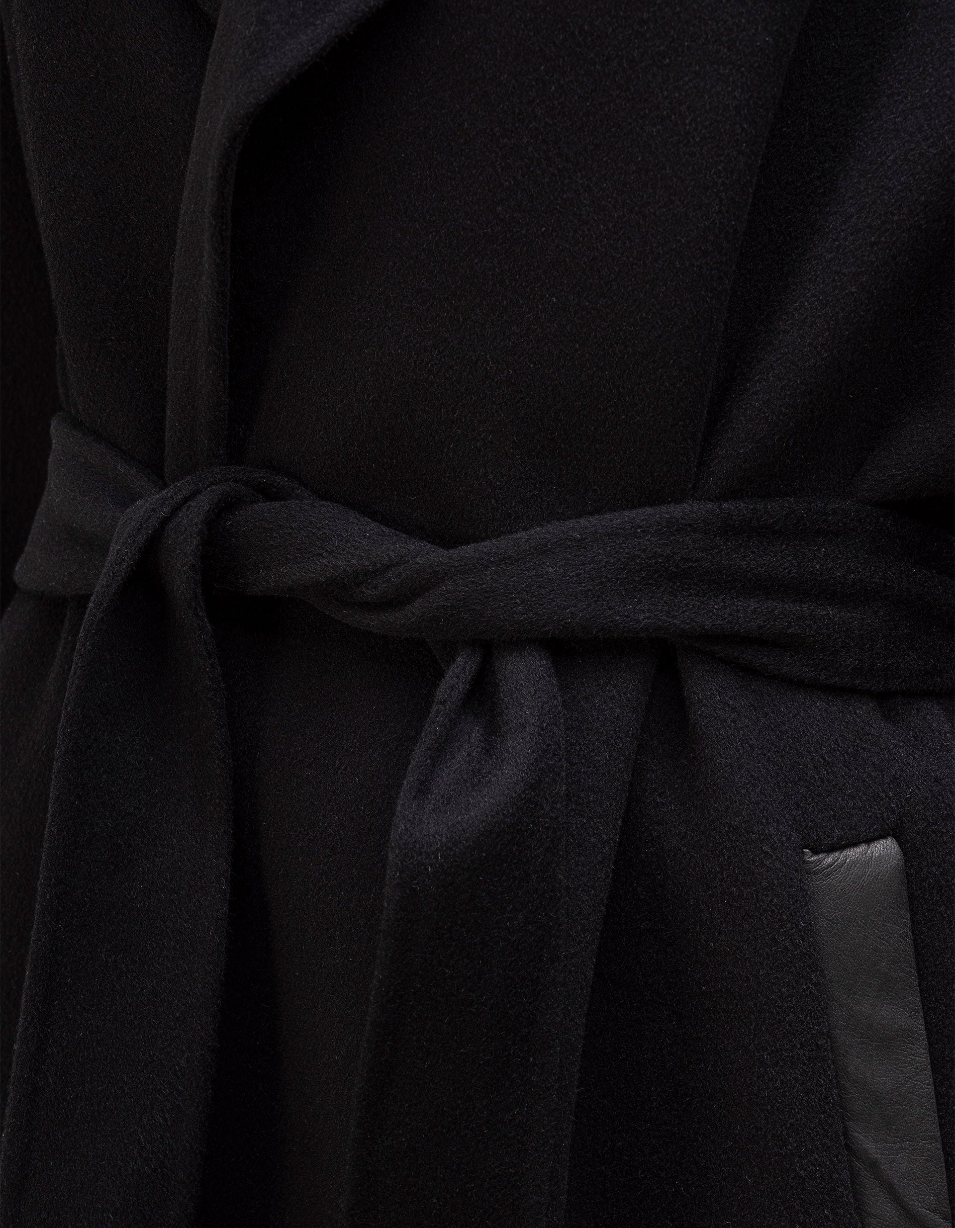 Woll-Kaschmir-Mantel mit Bindegürtel und Leder-Details