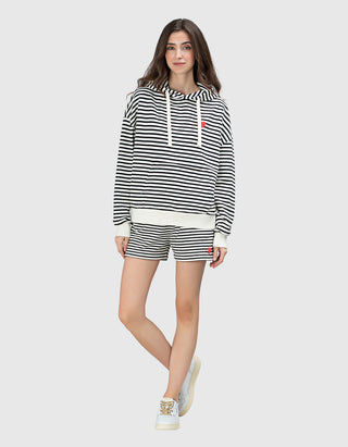 Die Silhouetten variieren von leicht oversized bis feminin gefittet. Dabei bleibt der Look immer entspannt, denn easy-to-wear ist das klar verfolgte Konzept. Ergänzend kommen Jersey-Essentials aus 100-prozentigem Organic Cotton hinzu, für T-Shirts, Polos, unifarben, in sportiven Ringeln oder gestreift. Stil prägend bleiben Schriftzüge und Applikationen, die das Thema variieren.